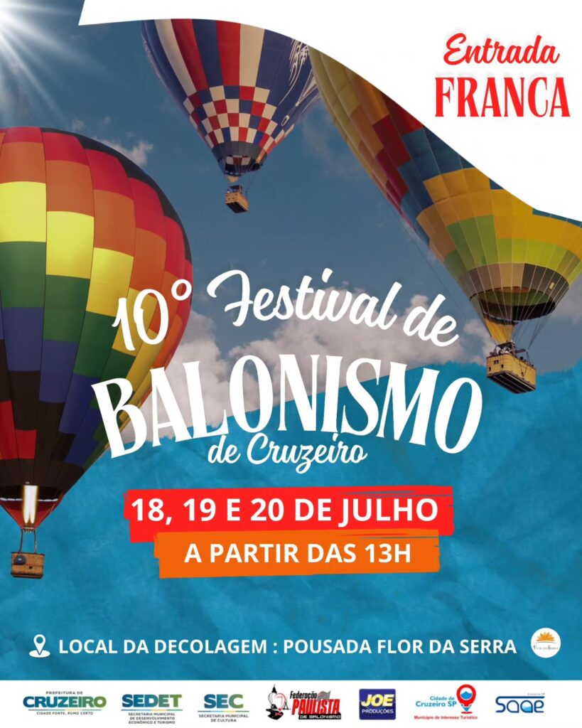 A Prefeitura de Cruzeiro, por meio das Secretarias de Cultura e Desenvolvimento Econômico e Turismo, tem o prazer de anunciar o apoio a mais uma edição do já tradicional Festival de Balonismo da cidade. A 10ª edição promete trazer diversas atrações imperdíveis, com os já conhecidos voos de balão que encantam a todos na Pousada Flor da Serra.